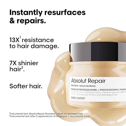Expert nourishing shampoo to repair and hydrate damaged hair. Powered by Gold Quinoa and Wheat Protein, the L’Oréal Professionnel Serie Expert Absolut Repair nourishing hair shampoo helps repair damaged hair. It nourishes and strengthens the hair fiber leaving hair feeling soft and hydrated. For best results use with the Absolut Repair hair mask. Expert nourishing mask to repair and hydrate damaged hair. Powered by Gold Quinoa and Wheat Protein the L’Oréal Professionnel Serie Expert Absolut Repair nourishing hair mask helps repair damaged hair. It nourishes and strengthens the hair fiber leaving hair feeling soft and hydrated.